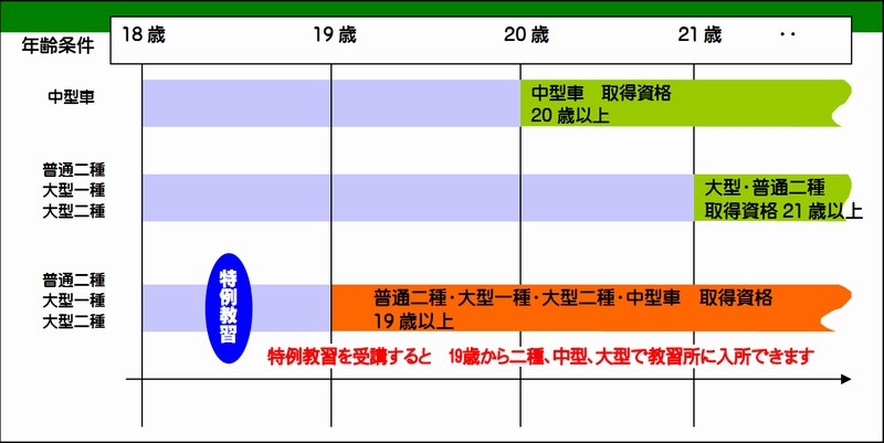 「受験資格特例教習」の教習は18歳以上で普通免許又は準中型免許を保有していれば受講出来ますが、大型、中型、二種免許の教習は「19歳以上、かつ普通免許又は準中型免許を1年以上」になってから教習できます。