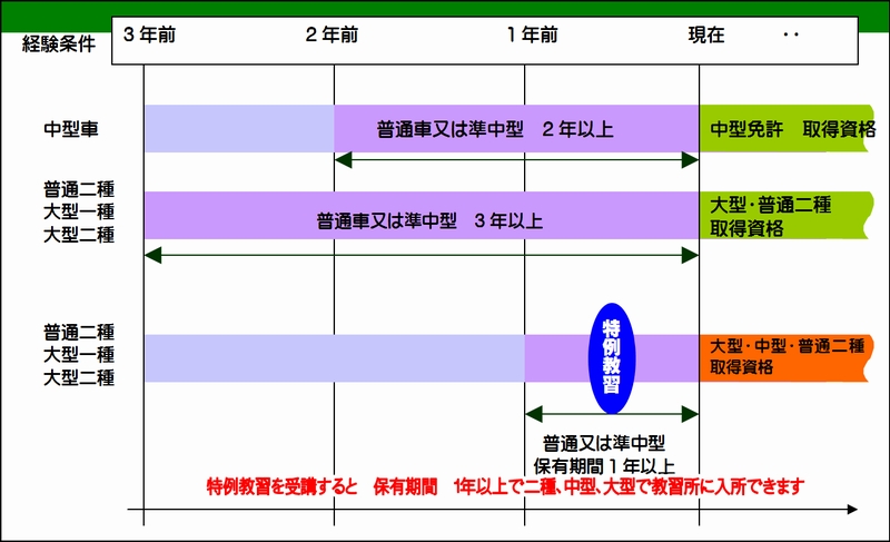 「受験資格 特例教習」とは、大型一種免許や二種免許における免許取得条件「21歳以上、かつ、普通免許又は準中型免許を3年以上保有している方」が、「19歳以上、かつ普通免許・準中型免許・大型特殊のいずれかの免許を通算して1年以上保有している方」に引きさげらる教習です。