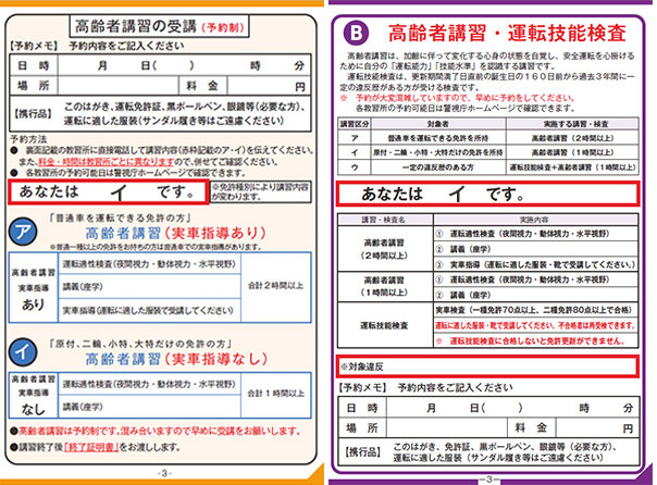 講習ハガキ「高齢者講習の受講」または「B高齢者講習・運転技能検査」に「イ」の記載があることを確認してください。