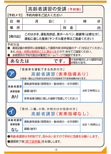 75歳未満予約ページ 飛鳥ドライビングカレッジ日野⾼齢者講習Web予約TOP75歳未満予約ページ 高齢者講習の受講には「事前予約が必要」です。お手元に届いた通知はがきをご用意の上、下記の手順ではがきの内容をご確認いただき、ご予約をお願いします。 STEP2 お手元のハガキはどれですか? ⾼齢者講習の予約(75歳未満) 「ア」と記載されたはがきをお持ちの方の予約はこちらから 「イ」と記載されたはがきをお持ちの方の予約はこちらから 資料請求・来校予約はこちら042-581-2721受付時間: 8:00~20:00(土祝19:00・日18:00)資料請求はこちら入校手続き・来校予約はこちら