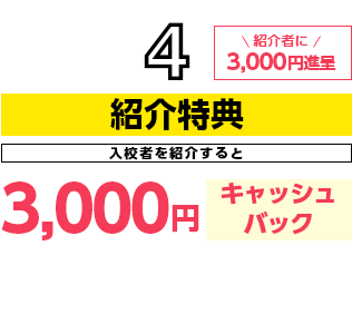 ※何名でもご紹介できますが、キャッシュバックは入校者1名に対して紹介者1名が対象となります。