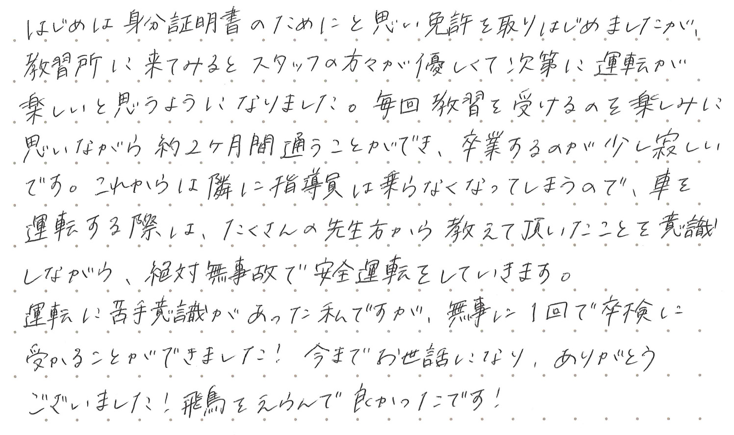 はじめは身分証明書のためにと思い免許を取りはじめましたが、教習所に来てみるとスタッフの方々が優しくて次第に運転が楽しいと思うようになりました。毎回教習を受けるのを楽しみに思いながら約2ヶ月間通うことができ、卒業するのが少し寂しいです。これからは隣に指導員は乗らなくなってしまうので、車を運転する際は、たくさんの先生方から教えて頂いたことを意識しながら、絶対無事故で安全運転をしていきます。運転に苦手意識があった私ですが、無事に1回で卒検に受かることができました!今までお世話になり、ありがとうございました!飛鳥をえらんで良かったです!