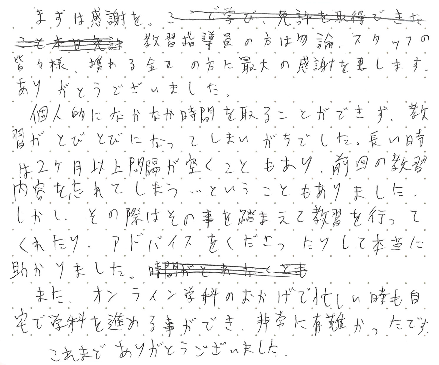 個人的になかなか時間を作ることができず、教習がとびとびになってしまいがちでした。長い時は、2か月以上間隔が空くこともあり、前回の教習内容を忘れてしまうということもありました。しかし、その際はそのことを踏まえて教習を行っていただいたり、アドバイスを下さったりして、本当に助かりました。