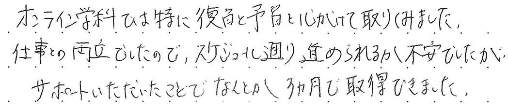 スケジュール通り進められるか不安でしたがサポートいただいたことでなんとか3ヶ月で取得できました。 飛鳥ドライビングカレッジ日野お客様からの声普通車ATスケジュール通り進められるか不安でしたがサポートいただいたことでなんとか3ヶ月で取得できました。 オンライン学科のひは特に復習と予習を心がけて取りくみました。仕事との両立でしたので、スケジュール通り進められるか不安でしたがサポートいただいたことでなんとか3ヶ月で取得できました。 令和4年1月15日 23歳 男性 資料請求・来校予約はこちら042-581-2721受付時間: 8:00~20:00(土祝19:00・日18:00)資料請求はこちら入校手続き・来校予約はこちら
