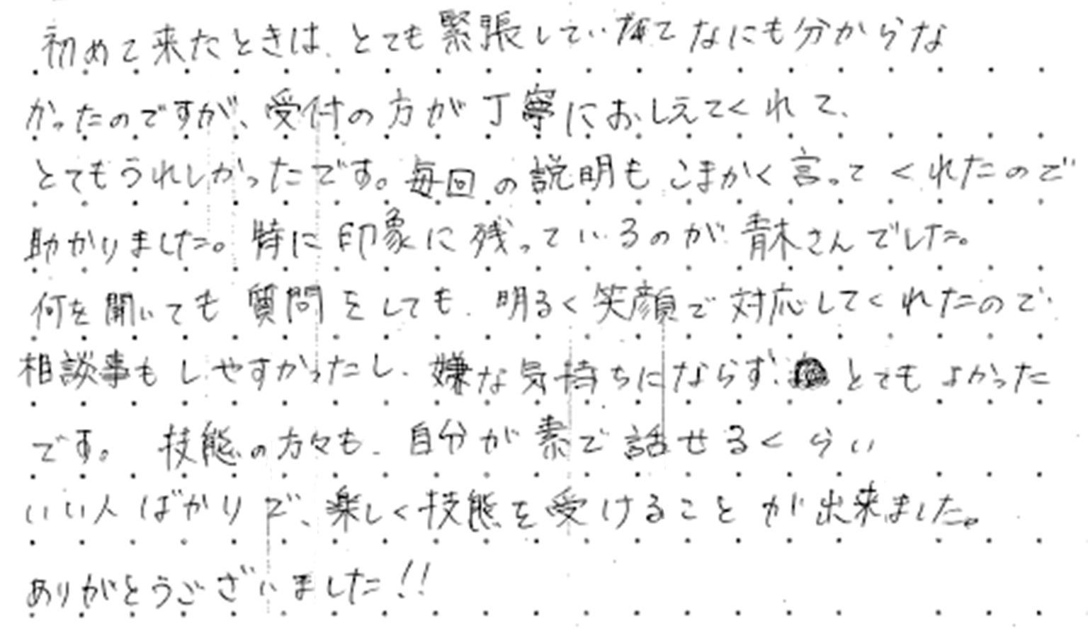 初めて来たときは、とても緊張していてなにも分からなかったのですが、受付の方が丁寧におしえてくれて、とてもうれしかったです。毎回の説明もこまかく言ってくれたので助かりました。特に印象に残っているのが青木さんでした。何を聞いても質問をしても、明るく笑顔で対応してくれたので、相談事もしやすかったし、嫌な気持ちにならず、とてもよかったです。技能の方々も、自分が素で話せるくらい、いい人ばかりで、楽しく技能を受けることが出来ました。ありがとうございました!!