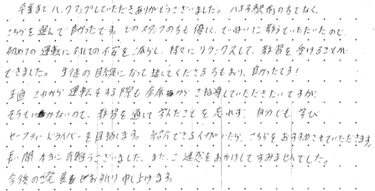 卒業までバックアップしていただきありがとうございました。八王子駅前の方ではなく、こちらを選んで良かったです。どのスタッフの方も優しく、ていねいに教えていただいたので、初めての運転に対しての不安を減らし、徐々にリラックスして、教習を受けることができました。生徒の目線になって接して下さる方もおり、良かったです!正直、これから運転をする際も座席からご指導していただきたいですが、そうもいかないので、教習を通して学んだことを忘れず、自分でも学び、セーフティードライバーを目指します。紹介できる人がいたら、こちらをおすすめさせていただきます。長い間本当に有難うございました。また、ご迷惑をおかけしてすみませんでした。今後のご発展をお祈り申し上げます。
