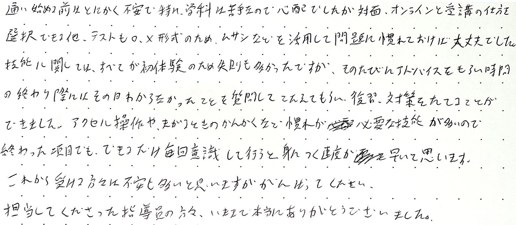 通い始める前はとにかく不安で、特に学科は苦手なので心配でしたが、対面・オンラインと受講の仕方を選択できる他、テストも◯×形式のためムサシなどを活用して問題になれておけば大丈夫でした。
