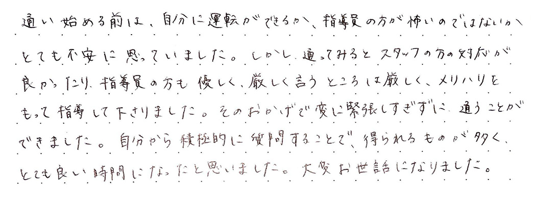 通い始める前は、自分に運転ができるか、指導員の方が怖いのではないか とても不安に思っていました。しかし、通ってみるとスタッフの方の対応が良かったり指導員の方も優しく、厳しく言うところは厳しく、メリハリをもって指導して下さりました。そのおかげで変に緊張しすぎずに、通うことができました。自分から積極的に質問することで、得られるものが 多く、 とても良い時間になったと思いました。大変お世話になりました。