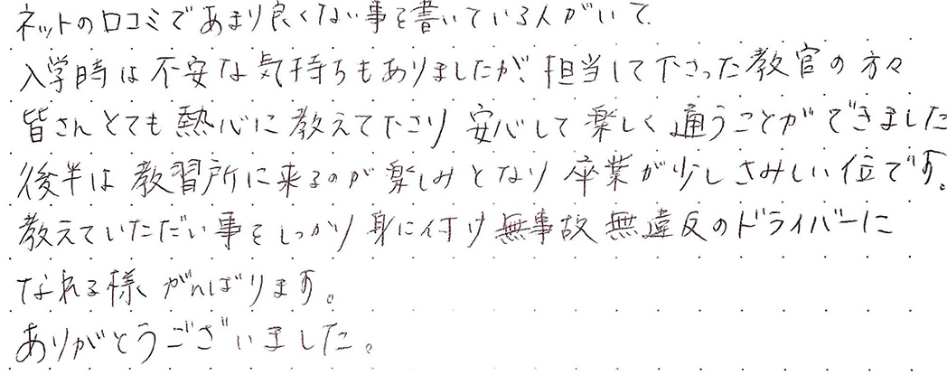 ネットでの口コミであまり良くない事を書いている人がいて入学時は不安な気持ちもありましたが、担当して下さった教官の方々皆さんとても熱心に教えて下さり、安心して楽しく通うことができました。