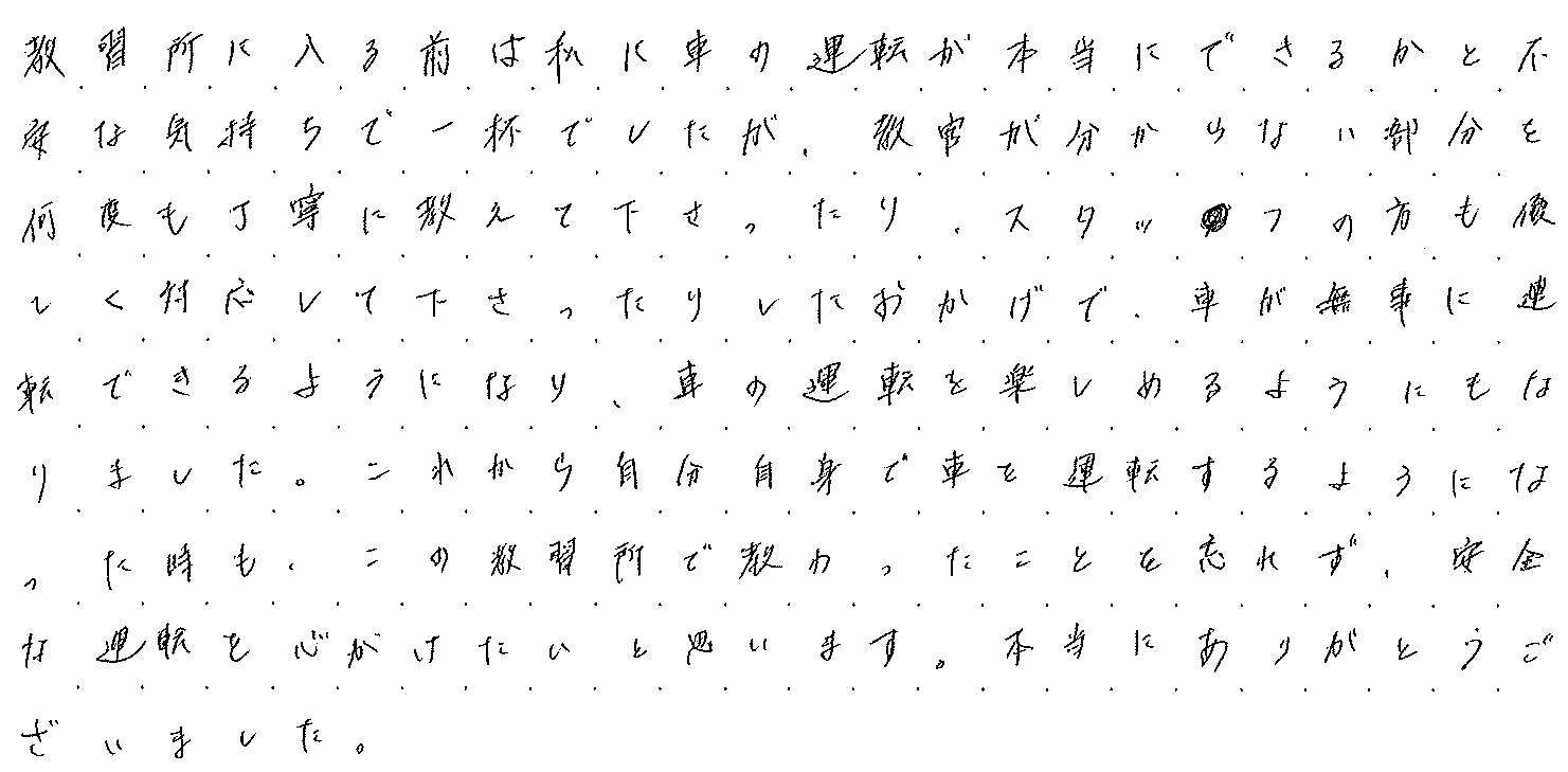 教習所に入る前は私に車の運転ができるかと不安な気持ちで一杯でしたが、教官が分からない部分を何度も丁寧に教えてくださったり、スタッフの方々も優しく対応してくださったりしたおかげで、車が無事に運転できるようになり、車の運転を楽しめるようにもなりました。これから自分自身で車を運転するようになった時もこの教習所で教わったことを忘れず、安全な運転を心がけていきたいと思います。本当にありがとうございました。