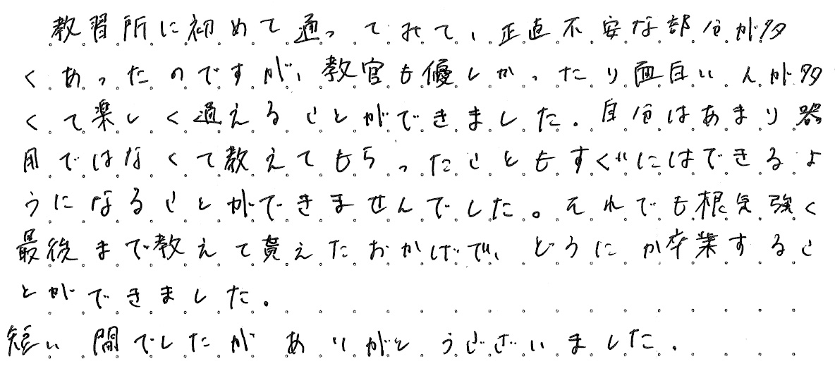 教習所に初めて通ってみて、正直不安な部分が多くあったのですが、教官も優しかったり面白い人が多くて楽しく通えることが出来ました。自分はあまり器用ではなくて教えてもらったこともすぐにはできるようになることができませんでした。それでも根気強く最後まで教えて貰えたおかげで、どうにか卒業することができました。短い間でしたが、ありがとうございました。