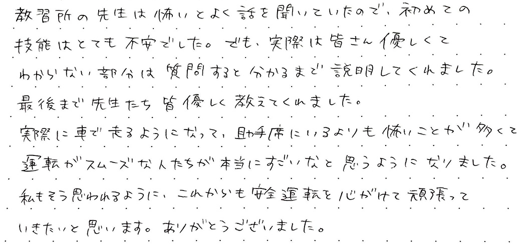 教習所の先生は怖いとよく話を聞いていたので、初めての 技能はとても不安でした。