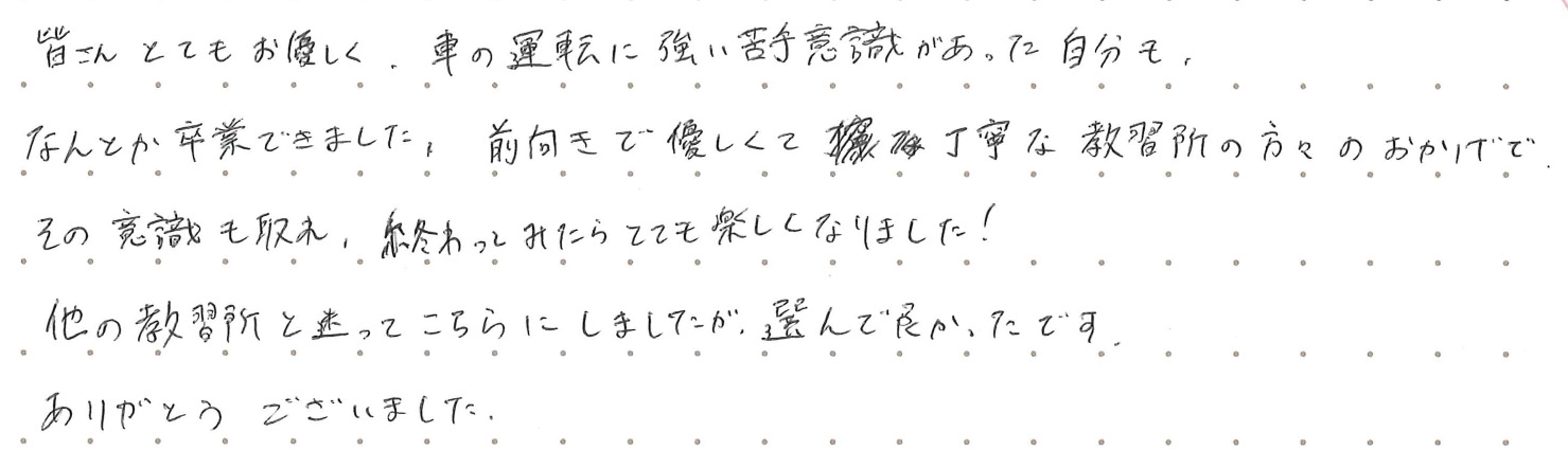 皆さんとてもお優しく、車の運転に強い苦手意識があった自分も、なんとか卒業できました。前向きで優しくて丁寧な教習所の方々のおかげで、その意識も取れ、終わってみたらとても楽しくなりました!他の教習所と迷ってこちらにしましたが選んで良かったです。ありがとうございました。