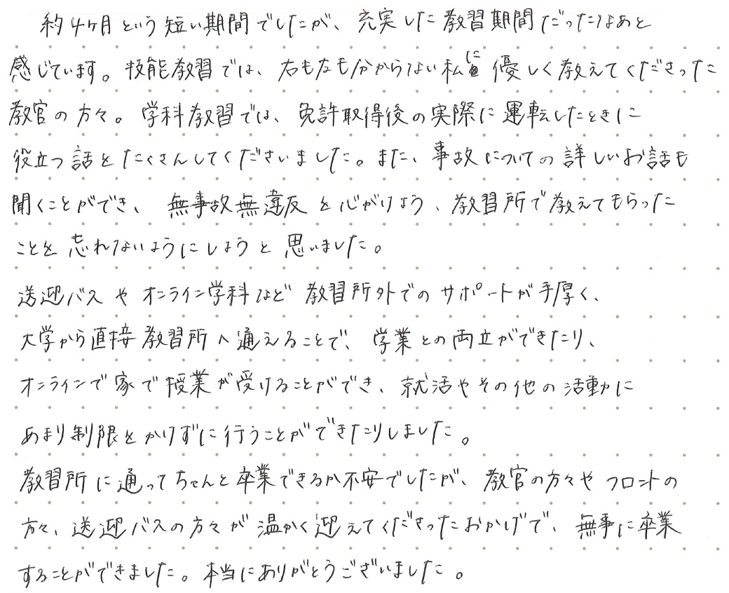 約4ヶ月という短い期間でしたが、充実した教習期間だったなあと感じています。技能教習では、右も左も分からない私に優しく教えてくださった教官の方々。学科教習では、免許取得後の実際に運転したときに役立つ話をたくさんしてくださいました。また、事故についての詳しいお話も聞くことができ、無事故無違反を心がけよう、教習所で教えてもらったことを忘れないようにしようと思いました。送迎バスやオンライン学科など教習所以外でのサポートが手厚く、大学から直接教習所へ通えるとで、学業との両立ができたり、オンラインで家で授業が受けることができ、就活やその他の活動にあまり制限をかけずに行うことができたりしました。教習所に通ってちゃんと卒業できるか不安でしたが、教官の方々やフロントの方々、送迎バスの方々が温かく迎えてくださったおかげで、無事に卒業することができました。本当にありがとうございました。