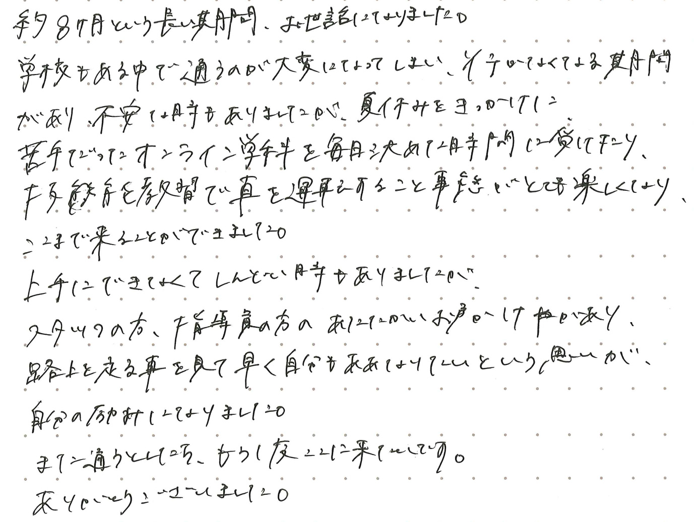 約8ヶ月と言う長い期間、お世話になりました。学校もある中で通うのが大変になってしまい、行かなくなる期間があり、不安な時もありましたが、夏休みをきっかけに苦手だったオンライン学科を毎日決めた時間に受けたり、技能教習で車を運転すること事態がとても楽しくなりここまでくることができました。