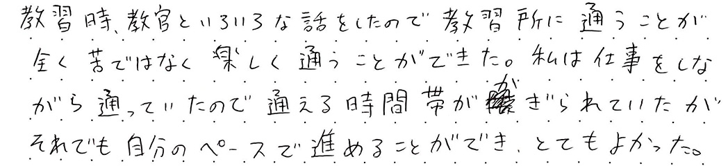 通える時間帯が限られていたが、それでも自分のペースで進めることができ、とてもよかった。 飛鳥ドライビングカレッジ日野お客様からの声普通車AT通える時間帯が限られていたが、それでも自分のペースで進めることができ、とてもよかった。 教習時、教官といろいろな話をしたので教習所に通うことが全く苦ではなく楽しく通うことができた。私は仕事をしながら通っていたので通える時間帯が限られていたが、それでも自分のペースで進めることができ、とてもよかった。 令和3年11月23日 18歳 女性 資料請求・来校予約はこちら042-581-2721受付時間: 8:00~20:00(土祝19:00・日18:00)資料請求はこちら入校手続き・来校予約はこちら