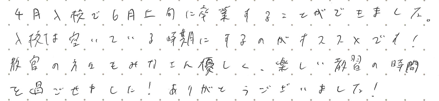 4月入校で6月上旬に卒業することができました。 飛鳥ドライビングカレッジ日野お客様からの声普通車AT4月入校で6月上旬に卒業することができました。 4月入校で6月上旬に卒業することができました。入校は空いている時期にするのがオススメです!教官の方々もみなさん優しく、楽しい教習の時間を過ごせました!ありがとうございました。 令和5年6月2日 資料請求・来校予約はこちら042-581-2721受付時間: 8:00~20:00(土祝19:00・日18:00)資料請求はこちら入校手続き・来校予約はこちら