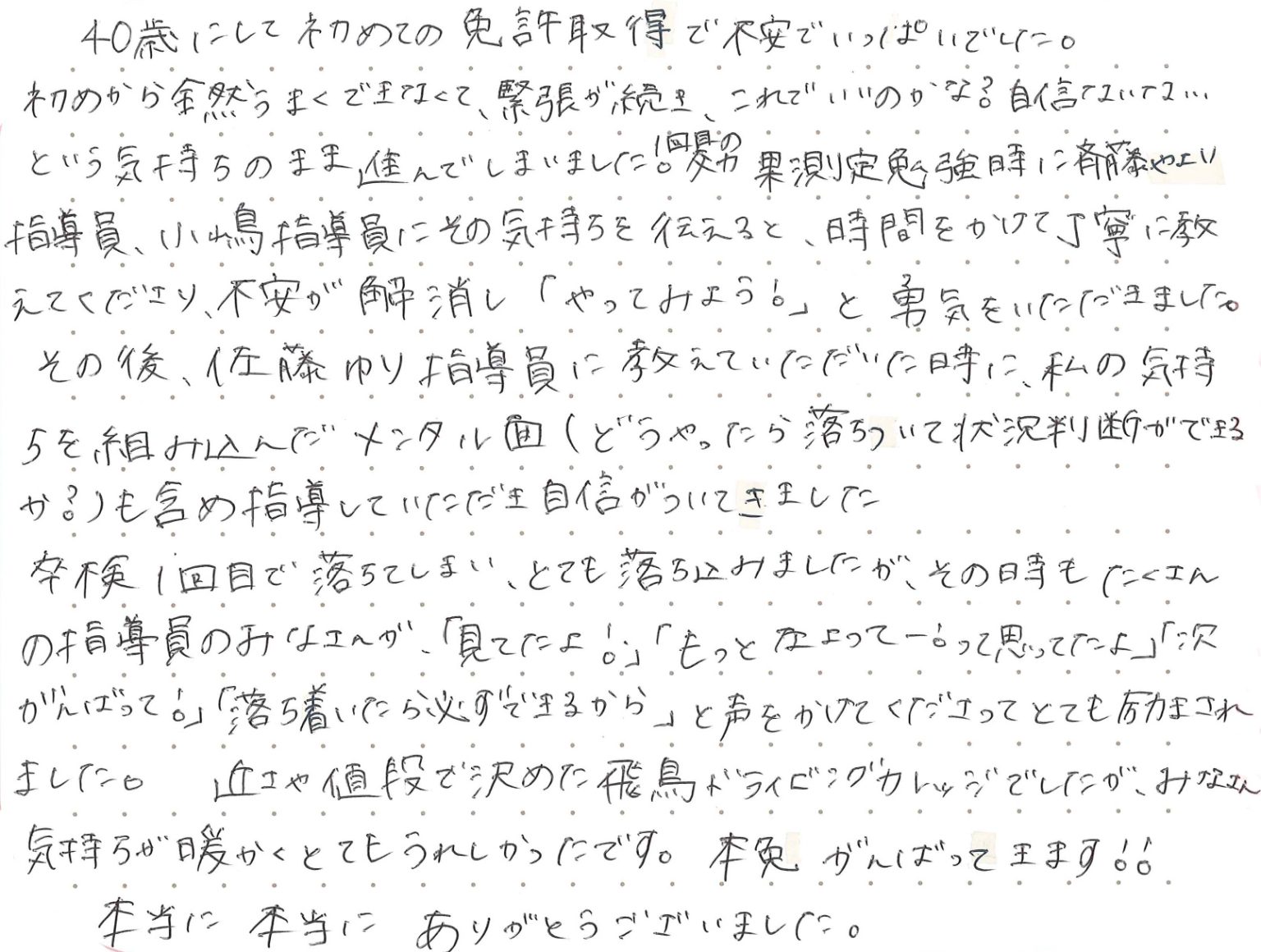 40歳にして初めての免許取得で不安でいっぱいでした。初めから全然うまくできなくて、緊張が続き、これでいいのかな?自信ないな…という気持ちのまま進んでしましました。1回目の効果測定勉強時に斉藤哉弥生指導員、小嶋指導員にその気持ちを伝えると、時間をかけて丁寧に教えてくださり、不安が解消し「やってみよう!」と勇気をいただきました。その後、佐藤有理指導員に教えていただいた時に、私の気持ちを組み込んだメンタル面(どうやったら落ちついて状況判断ができるか?)も含め指導していただき自信がついてきました。卒検1回目で落ちてしまい、とても落ち込みましたが、その時もたくさんの指導員のみなさんが、「見てたよ!」「もっと左よってー!って思ってたよ」「次がんばって!」「落ち着いたら必ずできるから」と声をかけてくださってとても励まされました。近さや値段で決めた飛鳥ドライビングカレッジでしたが、みなさん気持ちが暖かくとてもうれしかったです。本免がんばってきます!!本当に本当にありがとうございました。