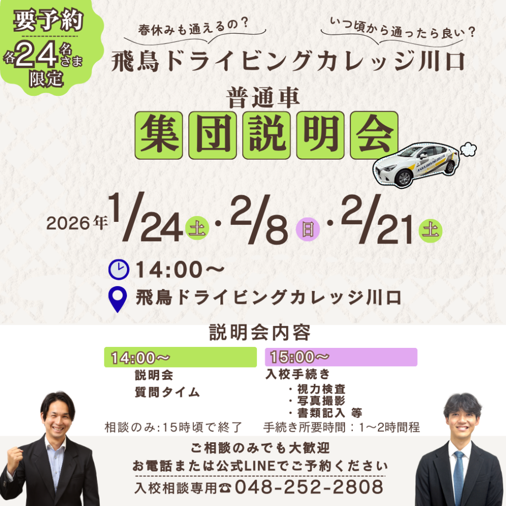 飛鳥ドライビングカレッジ川口では、クルマの免許をご検討の方向けに「説明会」を行っています。